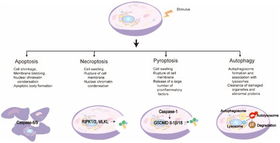 PCD is an active, orderly mode of cell death that is encoded in specific genes. Different types of PCD differ in their morphological features, signaling both the pathways and their resulting outcomes; here, we will mainly discuss the characteristics of the following types of PCD and their mutual regulation with the NLRP3 inflammasome: apoptosis, necroptosis, pyroptosis, and autophagy.