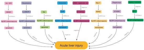 In recent years, increasing evidence has demonstrated that apoptosis plays an important role in APAP-induced liver injury; tune staining has also demonstrated that hepatocytes underwent massive apoptosis in an APAP-induced acute liver injury model in mice [123,124]. Kaempferol (KA), a flavonoid compound extracted from Penthorum chinense, has powerful anti-inflammatory and antioxidant activities. Du et al. found that KA inhibited the high mobility group protein B1 (HMGB1)/TLR4/NF-κB signaling pathway and the activation of the NLRP3 inflammasome, thereby protecting the liver from APAP-induced inflammatory responses and apoptosis [125]. Elshal et al. found that diacerein reduced NLRP3/caspase-1/IL-1β by downregulating the IL-4/Monocyte chemoattractant protein-1 (MCP-1) and TNF-α/ NF-κB inflammatory signaling pathways and mediating oxidative stress, mitochondrial dysfunction, necrosis, sterile inflammation, and apoptosis, thereby preventing and reversing APAP hepatotoxicity in mice [126]. In addition, recent studies have shown that pyroptosis and necroptosis also play a role in APAP-induced acute liver injury. Wang et al. found that targeting mitochondrial ROS (via peroxidase 3) inhibited NLRP3 inflammasome activation and prevented APAP-induced pyroptosis, thereby exerting hepatoprotective effects [127]. Receptor-interacting serine-threonine kinase (RIPK1) and RIPK3 play important roles in necroptosis, and Deutsch et al. found that in APAP mediated ALI, RIPK3 deletion or specifically blocking RIPK1 using Necrostatin-1 (Nec-1), an inhibitor of RIPK1, was protective against liver injury and associated with inhibition of NLRP3 inflammasome activation [128]. Another study suggested that Nec-1 attenuates APAP-induced liver injury by inhibiting the interaction between necroptosis and the NLRP3 inflammasome [129].