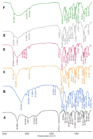 The spectra were made using two techniques of infrared spectroscopy, i.e., by pressing the sample with the matrix compound KBr (Figure 1) and the ATR technique (attenuated total reflection on the surface) (Figure S1). Both techniques allow us to obtain similar results; however, using an apparatus equipped with a zinc selenide crystal, we obtained ATR spectra, in which not all signals were clear (the spectra are included in the supplement). On the other hand, the comparison of the FTIR spectra of KBr and ATR made it easier to determine the bands originating from the vibrations of the hydroxyl group.