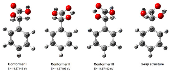Three structures of mandelic acid conformers were optimized by the DFT method. Figure 2 shows the optimized structures I–III and the monomer structure solved by X-ray diffraction [30]. Conformer II has the lowest energy. This structure is identical to the real structure of mandelic acid according to X-ray diffraction data (Figure 2). Further calculations of aromaticity, IR and NMR spectra, the energy of HOMO and LUMO orbitals, and NBO charge distribution were carried out for conformer II.