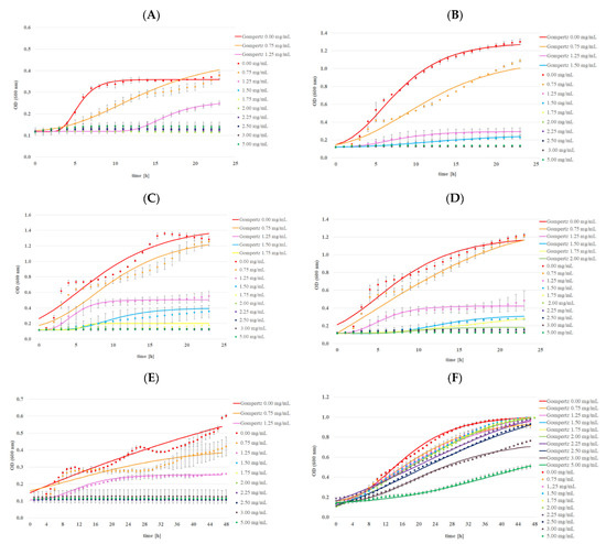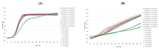 The growth of microorganisms was described in concentrations of MA in which an inhibitory effect was not observed. The modified Gompertz model was used for that purpose, according to Equation (1). Gompertz curves and kinetics parameters were generated by fitting the Gompertz equation to the OD data obtained previously using the Bioscreen C Pro device. All curves were fitted, and parameters were derived using LabPlot 2.9.0 by KDE.