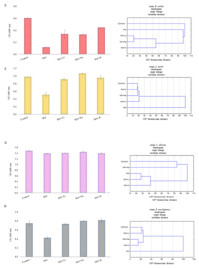 OD value on the last day of cultivation using Bioscreen C Pro (left) and dendrograms (right) for (A) L. monocytogenes ATCC 13932, (B) S. aureus ATCC 25923, (C) E. coli ATCC 25922, (D) S. typhimurium ATCC 14028, (E) B. subtilis ATCC 6633, (F) L. backii KKP 3566, (G) C. albicans ATCC 10231, and (H) R. mucilaginosa KKP 3560 in the presence of MA (5 mg/mL) and its salts (5 mg/mL). Control means the strain without any antimicrobial agent.