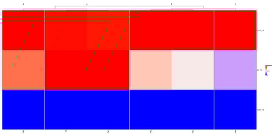 The inhibition test confirmed the negative effect of PA on the fungal mycelium growth. During the 5 days of the incubation, we observed a change in the structure of the mycelium (Figure S2). Through comparison of all of the PA treatments versus the control (PA 0), it was observed that the mycelium grew in a rarefied way, not fully covering the culture surface. Furthermore, it was possible to observe how the mycelium in contact with PA 0 presented the classic soft structure, while with the other concentrations of PA, a thin mycelium with an almost dry appearance was observed. Analysis of the inhibition areas measurements (Figure 1) indicated that the three strains of B. cinerea reacted differently to tested PA treatments, highlighting different degrees of sensitivity: strong, medium, and low. Observing the treatments applied, we were able to see, as a function of the cluster analysis, the formation of three groups.