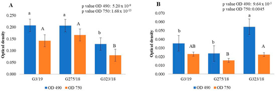 Optical density values from the MT2 microplates for the three different strains of B. cinerea in function of FF inoculating fluid (A) and PDB medium (B). Each value is represented with the standard error. The lower-case letters (referring to the 490 nm optical density) and the upper case letters (for the 750 nm optical density) represent the results obtained after applying the post hoc Wilcox test (Tables S1, S2, S4, S5, S7, S8, S10 and S11).