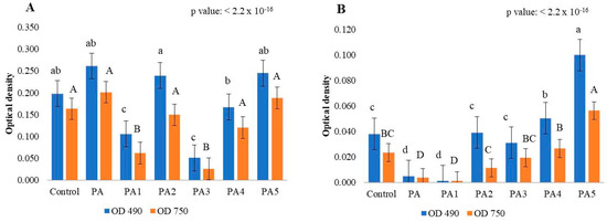 Optical density values from the MT2 microplates for the seven different analysed treatment of pyroligneous acid (PA) in function of FF inoculation fluid (A) and PDB medium (B). Each value is represented with the standard error. The lower-case letters (referring to the 490 nm optical density) and the upper case letters (for the 750 nm optical density) represent the results obtained after applying the post hoc Wilcox test (Tables S1, S3, S4, S6, S7, S9, S10 and S12). Abbreviation: Control is without adding PA; PA is PA pure; PA1 is PA 1:2; PA2 is PA 1:8; PA3 is PA 1:16; PA4 is PA 1:32; and PA5 is PA 1:36.