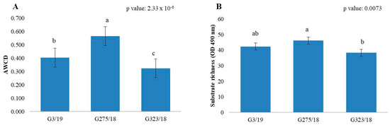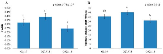AWCD (A) and substance richness (B) indices for the three different strains of Botrytis cinerea. Each value is represented with the standard error. The lower-case letters represent the results obtained after applying the post hoc Wilcox test (Tables S14–S18).