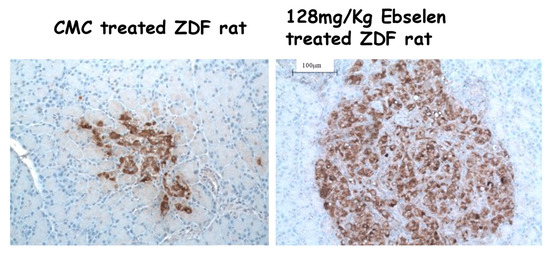 - Mahadevan, J.; Parazzoli, S.; Oseid, E.; Hertzel, A.V.; Bernlohr, D.A.; Vallerie SNLiu, C.; Lopez, M.; Harmon, J.S.; Robertson, R.P. Ebselen treatment prevents islet apoptosis, maintains intranuclearPdx-1 and MafA levels, and preserves β-cell mass and function in ZDF rats. Diabetes 2013, 62, 3582–3588. [Google Scholar] [CrossRef] [PubMed]