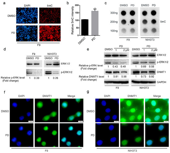 ERK regulates genome-wide DNA methylation. (a,b) PD treatment increased genome-wide 5 mC levels in F9 cells. F9 cells were treated with 1μM PD for 12 h, after which a methylation staining experiment was performed. ImageJ 1.49 software was used to determine 5 mC fluorescence intensity, and three images were analyzed for both the DMSO and PD groups. * p < 0.05. (c) PD treatment increased genome-wide 5 mC levels in F9 and NIH3T3 cells. F9 and NIH3T3 cells were treated with 1 μM PD for 12 h, after which genomic DNA was extracted and a dot blot experiment was performed. (d) Western blot results showing the effect of PD treatment. (e) PD treatment downregulated the expression of DNMT1. F9 and NIH3T3 cells were treated with 1 or 2 μM PD for 12 h, respectively, after which total protein samples were obtained for Western blotting. (f,g) PD treatment promoted the nuclear localization of endogenous DNMT1 in F9 and NIH3T3 cells. F9 and NIH3T3 cells were treated with 1 μM PD for 12 h, and immunofluorescence staining was performed.