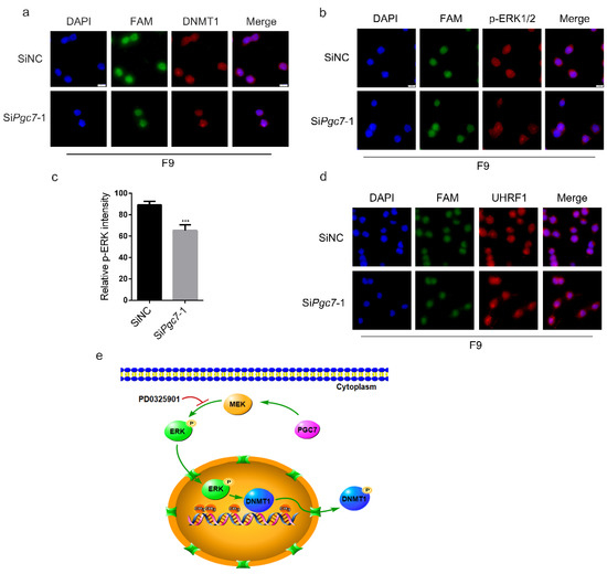 Figure 2f,g and Figure 3a show that PGC7 downregulated ERK phosphorylation, and the inhibition of ERK activity led to the accumulation of DNMT1 in the nucleus. Therefore, we speculate that PGC7 may regulate DNMT1 localization by regulating ERK phosphorylation. To test this hypothesis, Pgc7 was knocked down in F9 cells, and we assessed the subcellular localization of endogenous DNMT1 via immunofluorescence. We found that knockdown of Pgc7 promoted the nuclear localization of DNMT1 (Figure 5a) and resulted in decreased ERK activity (Figure 5b,c). In contrast, overexpression of PGC7 in NIH3T3 cells weakened the nuclear localization of endogenous DNMT1 (Supplementary Figure S3). In PGC7-overexpressing HEK293T cells and Pgc7-knockout oocytes, the presence of PGC7 alters DNMT1 localization by affecting UHRF1 localization, and ultimately changes patterns of DNA methylation [14,18]. Therefore, we speculate that the changes in DNMT1 localization and genome-wide DNA methylation caused by knocking down Pgc7 may have been caused by changes in the localization of UHRF1. However, our data indicate that UHRF1 localization did not change significantly after knocking down Pgc7 (Figure 5d), which suggests that PGC7 regulates the subcellular localization of DNMT1 by regulating ERK phosphorylation, but not by regulating the localization of UHRF1.