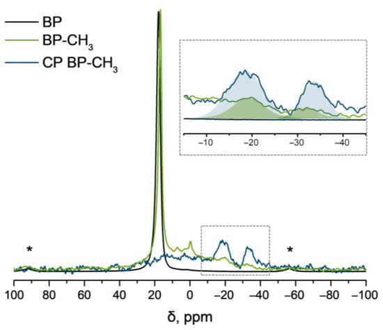 - Martini, F.; Borsacchi, S.; Barcaro, G.; Caporali, M.; Vanni, M.; Serrano-Ruiz, M.; Geppi, M.; Peruzzini, M.; Calucci, L. Phosphorene and Black Phosphorus: The 31P NMR View. J. Phys. Chem. Lett. 2019, 10, 5122–5127. [Google Scholar] [CrossRef]