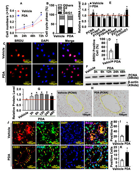 2.2. PDA Promotes Vascular Endothelial Cell Proliferation