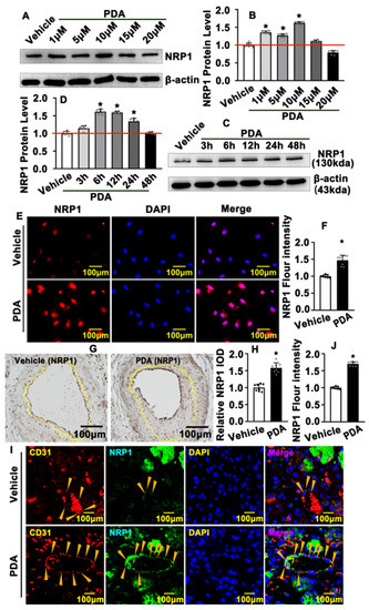 2.4. PDA Induces Vascular Endothelial Cell NRP1 Expression after Vascular Injury