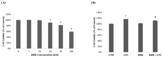 Cell viability analysis of BHB. Cell viability evaluated by MTT test, initially with BV2 cells, with dose–response curves for concentrations from 5 mM to 100 mM (A). The 5 mM concentration of BHB was used in the next experimental phase to treat cells in the absence or in the presence of LPS (1 µg/mL) (B). Results are presented as means ± SDs of three independent experiments performed in triplicate of percentages compared to control values. * p < 0.05 compared to the same time points for the CTR. # p < 0.05 compared to the LPS time points.
