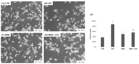 Morphological assay after administration of BHB with or without LPS. Morphological assay of BV2 cells in different conditions: control (A), 1 µg/mL LPS (B), 5 mM BHB (C) and BHB with 1 µg/mL LPS (D). Bar: 75 µm (20× objective). The arrows indicate the cells that underwent morphological change. Cell areas expressed in µm2 were quantified using ImageJ software (Panel E). Data are expressed as the means of three cell areas calculated from three independent experiments performed in triplicate ± SDs from three independent experiments. * p < 0.05 compared to CTR. # p < 0.05 compared to LPS.