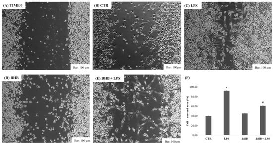 BV2 cell wound-closure assay results following administration of BHB with or without LPS. The cuts on the BV2 cell monolayer were evaluated 24 h after treatment in the different conditions: BV2 cells at time 0 (A), BV2 control (B), LPS (C), 5 mM BHB (D) and BHB + LPS (1 µg/mL) (E). The images are representative of three independent replicates for each experiment. The results are expressed as means ± SDs of the percentages of wound closures compared to the 0-time condition (F), using ImageJ software. * p < 0.05 compared to CTR. # p < 0.05 compared to LPS.