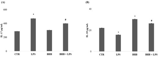 Effects of BHB on cytokine expression. Analysis of cytokine expression, performed by ELISA assay, of IL-17 (A) and IL-10 (B) with stimulation of 5 mM of BHB in the presence or absence of LPS (1 µg/mL). Experimental data are expressed as the means (pg/mL) ± SDs of three independent experiments. * p < 0.05 compared to the CTR. # p < 0.05 with respect to the LPS condition.