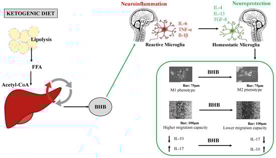 The ketogenic diet (KD), a diet characterized by low levels of carbohydrates and proteins [1] but a high intake of fat, was initially used mainly for the treatment of drug-resistant epilepsy in humans, precisely in children, from the beginning of the 20th century [2]. In recent years, KD has been the subject of further studies, as it has been increasingly confirmed that diet and health are closely related and that different distributions of macronutrients, especially in the case of KD, could have positive effects, especially in some pathologies [3]. For example, numerous studies have reported that KD improves obesity [4], diabetes [5], polycystic ovary syndrome (PCOS) [6] and other conditions [7]. KD has been recognized as a neuroprotective factor, especially in cases of brain injury and neurodegenerative diseases [8,9]. Neurodegenerative diseases, such as Parkinson’s disease (PD), amyotrophic lateral sclerosis (ALS), Alzheimer’s (AD) and Huntington’s disease (HD), are closely linked to a progressive loss of neuronal material and function [10]. The causes are to be attributed to infections and mutations, and therefore to genetic predispositions, as well as protein aggregates [11], which lead to chronic activation of the central nervous system (CNS) and consequently to high levels of inflammatory mediators [12]. The main cause of the probability of developing neurodegenerative diseases could be microglial activation [13]. Microglia, macrophages resident in the central nervous system, represent the first cell line that determines immune surveillance and host defense [14]. Cerebral microglia turn out to be very sensitive in perceiving the slightest variations in the surrounding environment, which variations determine their cellular activation [15]. Once activated, microglia are responsible for the phagocytosis of cellular debris and the production of proinflammatory mediators, reactive oxygen species (ROS), nitric oxide (NO), interleukin-6 (IL-6), interleukin-1β (IL-1β) and tumor necrosis factor-α (TNF-α) [16,17]. Unstimulated microglia are in a “resting” state, with a branched morphology and reduced cytoplasm [18]. This state contributes to brain homeostasis by regulating synaptic remodeling and neurotransmission [19]. Activated microglial cells polarize into the M1 proinflammatory phenotype (classical activation) [15,20]. This phenotype is induced by interferon-γ (IFN-γ) and lipopolysaccharide (LPS) [21] and is characterized by a larger soma and reduced ramifications, typically of amoeboid form [22]. The M1 phenotype releases inflammatory cytokines and chemokines, determining inflammation and neuronal death [23]. The polarization of microglia in the M2 phenotype (alternative activation) is characterized by a branched morphology and a small body [18] and is induced by anti-inflammatory cytokines, such as IL-4 and IL-13, and characterized by the production of anti-inflammatory cytokines and secondary metabolites, such as IL-10, transforming growth factor TGF-β, and insulin-like growth factor-1 (IGF-1), which are involved in tissue maintenance and repair [24]. Persistent activation of microglia in the M1-type proinflammatory state results in the transition of microglia to an amoeboid morphology associated with neuronal damage and overproduction of proinflammatory cytokines [25], the main factors responsible for an increased likelihood of developing neurodegenerative diseases, such as PD, AD and ALS [26,27]. Recently identified among the new therapeutic strategies that could benefit microglia and consequently reduce the onset of neurodegenerative diseases is the KD [28]. The KD may exert neuroprotective effects by modulating numerous inflammatory patterns [29]. It is assumed that this neuroprotective effect is determined by the presence of secondary metabolites, acetoacetate (AcAc) and, in greater quantities, β-hydroxybutyrate (BHB), produced by hepatic mitochondria [30], which are the main ketone bodies consumed by the organism, especially by the brain, to compensate for the lack of energy as alternative substrates for the Krebs cycle [31] when glucose levels drop, especially during fasting or as a result of the mechanisms induced by the ketogenic diet [32]. These mechanisms occur because the total amount of carbohydrates provided by the KD is about 20–50 g per day (5–10% of total daily energy) [33]. The restriction of the amount of carbohydrates decreases the production of insulin, which promotes lipolysis [34] and therefore the conversion of fatty acids into ketone bodies. Ketone bodies can easily cross the blood–brain barrier by simple diffusion or through certain transporters [32]. For this reason, they can exert beneficial effects in the CNS, including the modulation of neurotransmitter concentrations, the modulation of synaptic transmission or, at the same time, the improvement of mitochondrial function [35]. Among ketone bodies, BHB has a predominantly neuroprotective role, even at the microglial level [36], by modulating the response of immune cells, such as by inhibiting the activation of the NLRP3 inflammasome [37], with decreased levels of IL-1β and caspase-1, decreased ROS production, and reduced cell death observed in vitro and in vivo [38]. Furthermore, BHB is associated with greater oxidation of NADH [8], which raises levels of glutathione, the main intercellular antioxidant capable of preventing possible damage caused by ROS [39]. Reduced glutathione levels are associated with increased cognitive impairment, as occurs in Alzheimer’s disease and epilepsy [40]. There are some studies that have reported that microglial activation is a key event in neuroinflammation, which, in turn, is a central process in neurological disorders. As reported in the literature, in in vivo models, BHB, acting as an anti-inflammatory mediator, inhibited IL-6 and TNF-α generation and promoted BDNF and TGF-β production in the brain of LPS-treated mice. In vitro, BHB inhibi