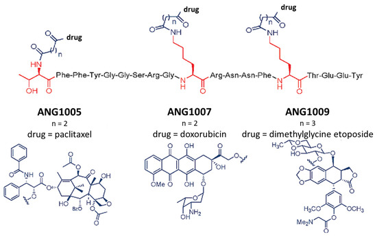 The structure of ANG1005, ANG1007, and ANG1009 [6]. The 3 amino acids that can be used as conjugation sites are marked in red, while the conjugated drugs with the used linkers are represented in grey.