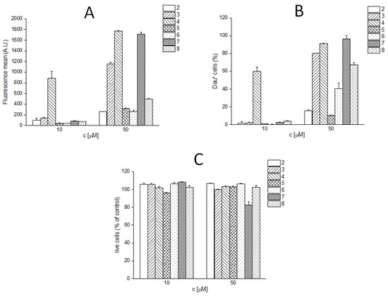 The in vitro cytostatic effect of any peptide–drug conjugate is influenced by many factors. One of the main effects is the cellular uptake of the conjugates by cells. Therefore, we compared the cellular uptake of the different conjugates on U87 glioblastoma cells. The cells were incubated with the conjugates (2, 10, and 50 µM) for 1 h. Then, after a washing step, the cells were treated with trypsin to remove the cell surface-bound conjugates and other cell surface structures that enable non-specific binding, so only the quantity of the conjugates actually entering the cells was detected by flow cytometry. In all cases, the fluorescence intensity values showed a good correlation with the percentage of daunomycin-positive cells (Figure 2A,B). In the case of one conjugate (7), a slight toxicity was observed during the measurement at a concentration of 50 µM (Figure 2C). The cellular uptake of the conjugates was concentration-dependent. The correlation between the cellular uptake and the cytostatic effect could be established in most cases. Conjugates 3 and 7, which showed the highest cytostatic effect, entered the cells very efficiently at a concentration of 50 µM (80% and 97% of cells were Dau+, respectively), while conjugate 2 showed very low uptake (15%) (Figure 2A,B). It seems that the slightly, but not significantly, higher cytostatic effect of conjugate 7 is related mainly to the elevated cellular uptake induced by the substituent on the side chain of 10Lys, but not because of the two drug molecules. Interestingly, conjugate 4, which showed moderate cytostatic effect, was taken up the most effectively: 90% of the cells were Dau+ at a concentration of 50 µM, while this value was 60% at a concentration of 10 µM. In contrast, all other compounds showed lower cellular uptake (<10%) at this concentration. In case of the conjugates 5 and 6, as well as the conjugate with 3 Dau (8), only 65–70% of the cells were Dau+ at a concentration of 50 µM. Presumably, the substitution of the side chain of Lys in position 15 with a drug molecule (2, 5, 6, and 8) significantly reduces the receptor binding of these conjugates, and, consequently, their cellular uptake. Thus, this low internalization ability is responsible for their lower in vitro cytostatic effect.