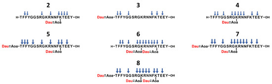 The peptides were synthesized starting from one batch of resin. In the case of the first lysine (15Lys), Fmoc-Lys(Mtt)-OH was coupled. Before the coupling of the second lysine derivative, the resin was split (1:1 ratio), and orthogonal protecting schemes were further applied to create the proper conjugation sites: Fmoc-Lys(Boc)-OH to compounds 1–3 and 5 and Fmoc-Lys(Dde)-OH to compounds 4 and 6–8. Before the coupling of the last amino acid derivative, the resins were divided again (1:1 ratio, both). In the case of the sequences containing a free amino group at the N-terminus (1, 2, 4, and 6), Boc-Thr(tBu)-OH was introduced to the peptide chain, while in the other cases (3, 5, 7, and 8), Fmoc-Thr(tBu)-OH was used. After the synthesis of the peptide’s backbone, the appropriate N-terminus and/or lysine side chain-protecting groups were selectively cleaved (Fmoc: 2% piperidine + 2% DBU + 0.1 M HOBt/DMF, Dde: 2% N2H4·H2O/DMF, Mtt: 1% TFA/DCM). Then, Boc-protected aminooxyacetic acid (Boc-Aoa-OH) was coupled with PyBOP, Oxyma Pure, and DIPEA (5:5:5:10 eq calculated for the free amino group). The peptides were cleaved from the resin with a mixture of 95% TFA, 2.5% TIS, and 2.5% distilled water in the presence of 10 eq of free aminooxyacetic acid as a ‘carbonyl capture’ reagent to prevent the undesired side reaction of the aminooxyacetylated peptide. The crude peptides were purified by RP-HPLC (KNAUER RP-HPLC, Knauer GmbH, Bad Homburg, Germany; Phenomenex Luna C18 column (10 μm, 100 Å, 250 × 21.2 mm), Torrence, CA, USA) and the products were identified by mass spectrometry (ESI-MS Bruker Daltonics Esquire 3000 Plus, Bremen, Germany).