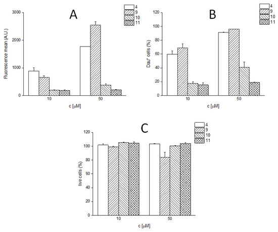 The in vitro cytostatic effect and the in vitro cellular uptake of the spacer-containing daunomycin–peptide conjugates (9–11) were studied on U87 human glioblastoma cells as previously described. The measured IC50 values are shown in Table 2, while the measured cellular uptake at 10 µM and 50 µM concentration are given in Figure 4. The fluorescence intensity values showed good correlation with the percentage of daunomycin-positive cells in the case of these conjugates as well. (Figure 4A,B). Conjugate 9 showed slight toxicity during the measurements at a concentration of 50 µM (Figure 4C).