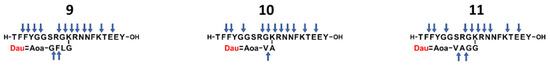 The identified cleavage sites (indicated by blue arrows) of the enzyme-labile spacer containing Angiopep-2–daunomycin conjugates in lysosomal homogenate.