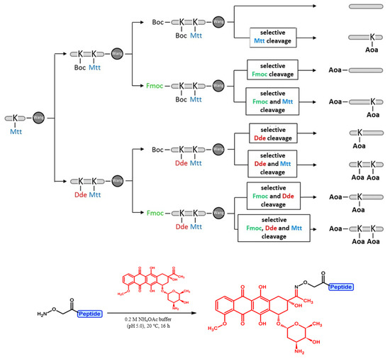 Synthetic protocol of different Angiopep-2–daunomycin conjugates using orthogonal side chain protecting groups (marked with different colors).