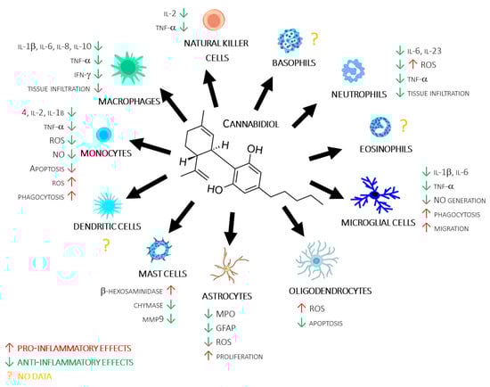 For example, Huang and colleagues found an anti-inflammatory effect for CBD in RAW 264.7 macrophages, with a significant reduction in IL-1β, TNF-α, and IL-6 production in both macrophage [81,82,83] and monocyte [84,85] cell lines, as well as in human monocytes [86]. The inhibitory effect of CBD on proinflammatory cytokine production/release was confirmed in an experimental autoimmune encephalomyelitis (EAE) model, in which Dopkins and colleagues found CBD treatment to reduce IL-1β production [87]. On the other hand, other authors found a proinflammatory effect for CBD. In this regard, Muthumalage and Rahman found a proinflammatory effect for CBD in a U937 macrophage line, with a significant increase in IL-1 receptor, IL-8, IL-16, and IL-32 production. The proinflammatory effect of CBD on macrophages was confirmed in RAW264.7, in which CBD induced, in a dose-dependent manner, an increase in proinflammatory cytokines such as IL-12 [88,89] and a decrease of anti-inflammatory cytokines such as IL-10 [88].