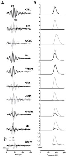 Oscillatory potentials (OP) recorded after intraocular injection of agents: (A) Representative recording of mixed rod/cone-driven OP under dark adaptation in response to light stimuli of 15 cd·s·m−2 in control conditions and under the effect of various agents. All recordings were obtained from an animal sample of the different experimental conditions. High-pass digital filtering of 100 Hz was performed on ERG flash recordings. The right eye (RE, black line) was injected with 1 μL of PBS solution (CTRL) or 1 μL of PBS solution containing APB (25 mM), GABA (100 mM), Bicuculline (10 mM), TPMPA (25 mM), Glutamate, DNQX (30 mM), Glycine (10 mM), Strychnine (25 mM), or HEPES (25 mM). One μL of PBS was injected into the left eye (LE, grey line). (B). Power Density (μV2/Hz) analysis was performed on trace recordings shown in A. Analysis of the right eye (black line) is superimposed on the left eye (grey line).
