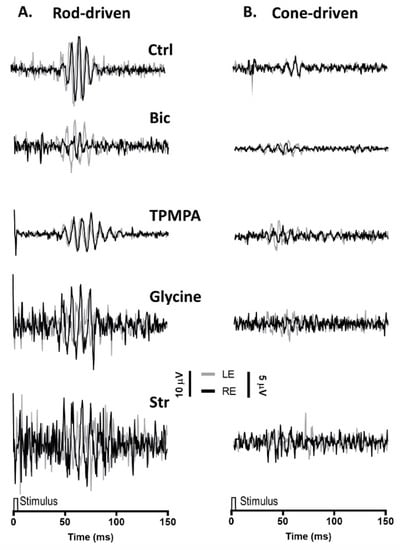 Oscillatory potentials (OP) driven by rod and cone photoreceptors after intravitreal injections of agents: (A), Representative rod-driven OP recordings under dark adaptation in response to light stimuli of 0.01 cd·s·m−2 and (B) cone-driven OP recordings under light adaptation in response to light stimuli of 15 cd·s·m−2. Control recording (Ctrl) and the effect of Bicuculline (10 mM), TPMPA (25 mM), Glycine (10 mM), and Strychnine (10 mM) is shown. All pairs of recordings were obtained from an animal sample of the different experimental conditions.