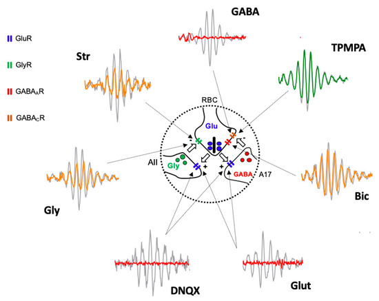 The intraocular application of agents has provided some clues about the mechanism that generates the scotopic-recorded OPs. With the intention of explaining these mechanisms more clearly, the sites of action of the neuroactive agents used in this study are shown in Figure 1. After intraocular injection of TPMPA, no effect on OP oscillation amplitudes could be observed. On the contrary, Bicuculline, Glycine, Strychnine, and HEPES, induced a significant decrease in the OP amplitudes. However, all the other agents (APB, GABA, Glutamate, and DNQX) almost completely eliminate the oscillations of the OPs. These effects indicate that glycinergic and GABAA receptors are critical for the genesis of OPs, but the contribution of the GABAC receptor must not be considered. Some studies have previously described in different animal species that both GABAA and Glycine receptor antagonists and agonists can partially or completely eliminate OPs: carp and mudppupy [1]; rat: [22,23,24]; and mice: [25,26]. In our experiments, we used a single effective drug concentration; although, the use of different drug concentrations may also justify the effects observed by other authors, since the effect of the GABAA and Glycine receptors depend on the concentration of the applied agents (review: [27,28]).