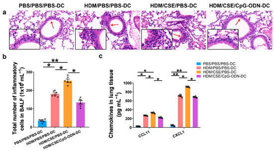 - Li, H.T.; Lin, Y.S.; Ye, Q.M.; Yang, X.N.; Zou, X.L.; Yang, H.L.; Zhang, T.T. Airway inflammation and remodeling of cigarette smoking exposure ovalbumin-induced asthma is alleviated by CpG oligodeoxynucleotides via affecting dendritic cell-mediated Th17 polarization. Int. Immunopharmacol. 2020, 82, 106361. [Google Scholar] [CrossRef] [PubMed]
