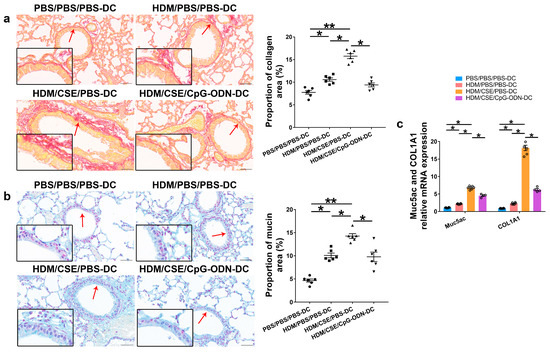 Based on our previous study, we used the adoptive transfer of BMDCs to establish a smoke-related asthma model and determine CpG-ODN function via the DCs pathway in regulating HDM/cigarette smoke extract (CSE)-induced lung inflammation in mouse models (Additional file 1: Figure S1). We injected phosphate-buffered saline (PBS)/PBS/PBS-pulsed, HDM/PBS/PBS-pulsed, HDM/CSE/PBS-pulsed, or HDM/CSE/CpG-ODN-pulsed BMDCs into C57BL/6 mice. After re-challenge with HDM or PBS, the HDM/CSE/PBS-DC group showed an elevated degree of inflammatory cell infiltration in peribronchial and perivascular tissues compared to the PBS/PBS/PBS-DC group (Figure 1a). Total inflammatory cell number in bronchoalveolar lavage fluid (BALF) (Figure 1b) and the expressions of eosinophil chemotactic factor (CCL11) and neutrophil chemotactic factor (CXCL1) in the lung homogenate (Figure 1c) were significantly higher in the HDM/PBS/PBS-DC group than in the PBS/PBS/PBS-DC group, but significantly lower than in the HDM/CSE/PBS-DC group. Consistently, in terms of airway reconstruction, collagen deposition (Figure 2a), mucin production (Figure 2b), and levels of airway remodeling indicators, including Mucin 5ac (Muc5ac) and Collagen type I alpha 1 (COL1A1) (Figure 2c) were significantly higher in the HDM/PBS/PBS-DC group than in the PBS/PBS/PBS-DC group, but significantly lower than in the HDM/CSE/PBS-DC group. Comparing the HDM/CSE/PBS-DC group with the HDM/CSE/CpG-ODN-DC group, all of the above processes could be inhibited by CpG-ODN in the smoke-related asthma model (Figure 1 and Figure 2). Taken together, these data demonstrated that smoke-related asthma exerts severe inflammatory responses and airway reconstruction, while CpG-ODN can suppress airway inflammation, airway collagen deposition, and mucin-producing cell hyperplasia through the DCs pathway in the mice model.