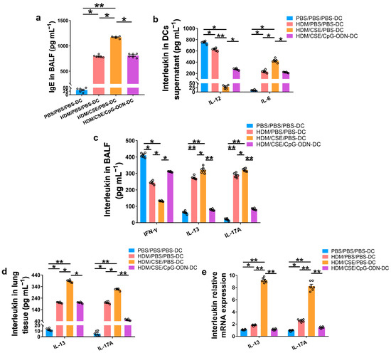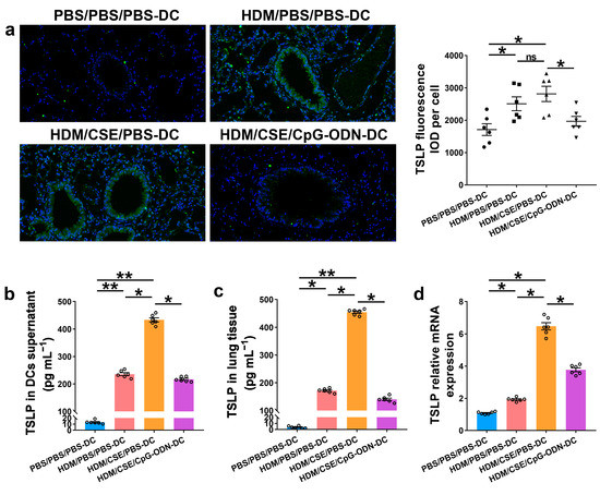 To further verify whether CpG-ODN alleviates Th2/Th17-type inflammatory responses in smoke-related asthma by inhibiting the TSLP-DC pathway, consequently, the levels of TSLP, anti-HDM IgE, proinflammatory or anti-inflammatory cytokines, and Th1/Th2/Th17-cytokines were detected in the smoke-related asthma model induced by adoptive transfer of BMDCs. TSLP biosynthesis is associated with disease severity and occurs in structural and immune cells at the site of entry of allergens in the respiratory tract. Next, we assessed the levels of TSLP by immunofluorescence staining (Figure 3a), enzyme-linked immunosorbent assay (ELISA) (Figure 3b,c), and quantitative real-time polymerase chain reaction (qRT-PCR) (Figure 3d). The outcomes showed that the TSLP gene and protein expression levels were significantly increased in the HDM/CSE/PBS-DC group than in the PBS/PBS/PBS-DC and HDM/PBS/PBS-DC groups (Figure 3). Concurrently, HDM-specific IgE (Figure 4a) and IL-6 (Figure 4b) protein levels, and the mRNA and protein levels in type 2 inflammation represented by IL-13 (Figure 4c–e) and type 17 inflammation represented by IL-17A (Figure 4c–e) were significantly increased in the HDM/CSE/PBS-DC group compared to the PBS/PBS/PBS-DC and HDM/PBS/PBS-DC groups. On the other hand, IL-12 (Figure 4b) levels in BMDCs supernatants and type 1 inflammation represented by IFN-γ (Figure 4c) amounts in BALF were significantly decreased in the HDM/CSE/PBS-DC group compared to the PBS/PBS/PBS-DC and HDM/PBS/PBS-DC groups.