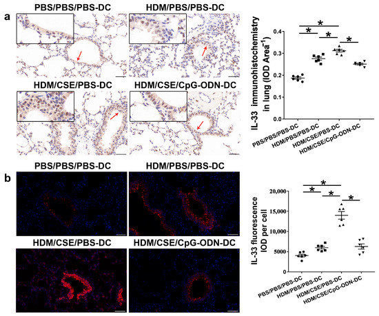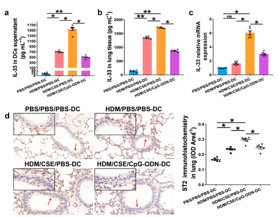IL-33/ST2 is a key player in allergic airway diseases. Tobacco smoke elevates the level of IL-33/ST2 in mice, causing airway inflammation and mucin expression in the airway. To examine the correlation between CpG-ODN treatment and IL-33/ST2 expression, we quantitated the IL-33/ST2 levels. The levels of IL-33 mRNA and protein reflected by immunohistochemistry (Figure 5a), immunofluorescence staining (Figure 5b), ELISA (Figure 6a–b), and qRT-PCR (Figure 6c) were significantly higher in the HDM/CSE/PBS-DC group than in PBS/PBS/PBS-DC and HDM/PBS/PBS-DC groups. Similar to IL-33, the ST2 levels had the same change between these groups, as examined by immunohistochemistry (Figure 6d). Moreover, after CpG-ODN treatment, mice in the HDM/CSE/CpG-ODN-DC group had significantly decreased IL-33 and ST2 mRNA and protein levels compared to the animals in the HDM/CSE/PBS-DC group (Figure 5 and Figure 6). These data suggested that the smoke-related asthma murine model has more expression of IL-33 and ST2, which is downregulated by CpG-ODN.