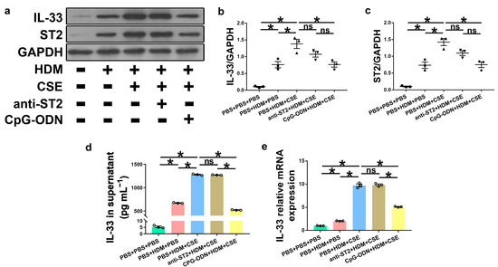 HBE cells were purchased from Guangzhou Cellcook Biotechnology (Guangzhou, Guangdong, China), and authentication was performed by short tandem repeat (STR) DNA profiling (Biowing Applied Biotechnology, Shanghai, China). HBE cells were cultured in MEM with 10% FBS in a CO2 incubator (5% CO2 with saturated humidity at 37 °C) and assigned to five groups. (1) In the control group (PBS + PBS + PBS), the cells were pretreated with PBS for 1 h and then administered PBS for 8 h; (2) in the HDM group (PBS + HDM + PBS), HBE cells were pretreated with PBS for 1 h, followed by HDM (400 U mL−1) for 8 h; (3) in the HDM/CSE group (PBS + HDM + CSE), HBE cells were pretreated with PBS for 1 h, and then with HDM (400 U mL−1) and CSE (2.5%) for 8 h; (4) in the Anti-ST2 Ab/HDM/CSE group (anti-ST2 + HDM + CSE), HBE cells underwent pretreatment with anti-ST2 Ab (i.e., sST2, 10 μg mL−1, R&D Systems, Minneapolis, MN, USA) for 1 h, and then HDM (400 U mL−1) and CSE (2.5%) were administered for 8 h; (5) in the CpG-ODN/HDM/CSE group (CpG-ODN + HDM + CSE), HBE cells underwent CpG-ODN (5 × 10−6 M) pretreatment for 1 h, followed by the addition of HDM (400 U mL−1) and CSE (2.5%) for 8 h. The treatment doses for HDM and anti-ST2 Ab were acquired from previous successful experiments, with no cytotoxicity detected in the current preliminary experiments [62,63]. CpG-ODN and CSE doses were obtained from our preliminary experiments [25]. Subsequently, the supernatants and cells were collected to detect the levels of IL-33, TSLP, and ST2.