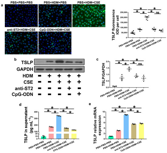 IL-33, TSLP, and IL-25 are collectively referred to as epithelium-derived cytokines. To further examine the correlations among CpG-ODN, IL-33/ST2, and TSLP, we performed an in vitro assessment of HBE cells. Compared to PBS administration alone, HBE cells with HDM administration showed more IL-33/ST2 mRNA and protein, as examined by Western blotting (Figure 7a–c), ELISA (Figure 7d), and qRT-PCR (Figure 7e). Similar to IL-33/ST2, TSLP levels were examined by using immunofluorescence staining (Figure 8a), Western blotting (Figure 8b,c), ELISA (Figure 8d), and qRT-PCR (Figure 8e), which showed a similar change trend between the PBS + PBS + PBS and PBS + HDM + PBS groups. After co-exposure to HDM and CSE, HBE cells showed more expression of IL-33/ST2 and TSLP than HBE cells with the administration of HDM alone (Figure 7 and Figure 8). Compared anti-ST2 + HDM + CSE group with PBS + HDM + CSE group, we found that pretreatment of HBE cells with anti-ST2 neutralizing Abs significantly declined the mRNA and protein levels of TSLP (Figure 8) but did not have a significant effect on levels of IL-33 and ST2 (Figure 7). The administration of neutralizing Abs did not inhibit the expression but acted against the signaling pathway of IL-33/ST2 and then downregulated the expression of TSLP. Compared CpG-ODN + HDM + CSE group with PBS + HDM + CSE group, the pretreatment of HBE cells with CpG-ODN not only inhibited the expression of IL-33/ST2 but also effectuated the signaling pathway, thereby decreasing the expression of TSLP (Figure 7 and Figure 8). Compared to the anti-ST2 + HDM + CSE group, although the levels of IL-33/ST2 examined by Western blotting (Figure 7a–c) and levels of TSLP examined by immunofluorescence staining (Figure 8a) did not differ significantly, the levels of IL-33 examined by ELISA and qRT-PCR (Figure 7d,e) and TSLP examined by ELISA and qRT-PCR (Figure 8d,e) were significantly decreased in the CpG-ODN + HDM + CSE group. At the cellular level of HBE, CpG-ODN strongly downregulated TSLP more than anti-ST2. These results indicated that IL-33/ST2 upregulates TSLP, while CpG-ODN inhibits this process.