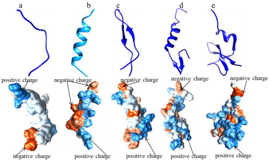The 3D structures of typical AMPs (Source: Protein Data Bank (PDB); Tool: UCSF Chimera). (a) 1F0F: AMP, the α-helix structure of CecropinA (1–8); (b) 1LFC: AMP, the β-sheeted structure of LactoferricinB; (c) 1CW6: AMP, α-helix and β-sheeted unpacked structure of LeucocinA; (d) 1KJ6: AMP, the α-helix and β-sheeted packed structure of hBD3; (e) 1g89: AMP, the structure line of 1g89.