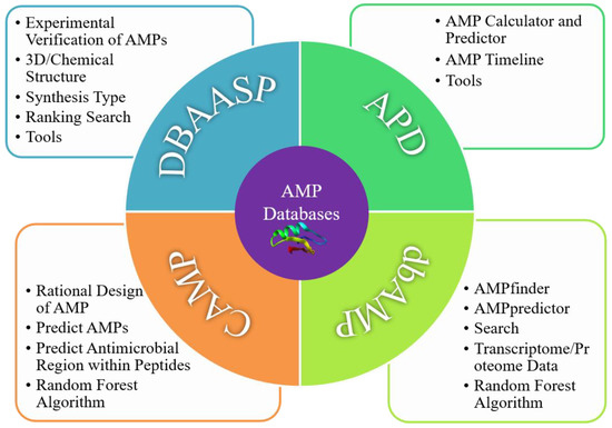AMP databases usually feature a number of functions, such as large datasets with logistical classification, accurate prediction abilities, fast searching, and unique computer algorithms. Their most important features include prediction tools and abundant data from different pathways. Those prediction tools were developed by analyzing the physicochemical properties, toxicity, and specificity of AMPs. Four databases (DBAASP, CAMP, APD, and dbAMP) are the most popular so far (see Table 1 and Table 2); their advantageous modules are shown in Figure 3. They are introduced one by one in the following sections [61].