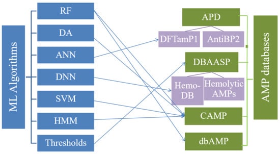 Machine learning (ML) algorithms have been integrated and used in a variety of disciplines such as psychology, biology, and neurophysiology as well as in mathematics and automation. They can improve the production of vaccines and the design and screening of AMPs and target drugs to improve efficiency and to reduce drug application [80]. The combination of biology and ML has greatly promoted the development of bioinformatics, in which many amino acid sequences of AMPs with higher-complexity structures are analyzed quickly, especially when processing high-throughput data from transcriptomics and proteomics [80,81]. At present, some mature ML algorithms are used in prediction software to categorize and analyze data, and the newly developed AMP databases also contain classical machine algorithms such as RF, SVM, DA, Artificial Neural Network (ANN), and Deep Neural Network (DNN) [82,83,84]. Previous studies have shown that MLs are an important feature of databases, especially in the CAMP database, which contains all of the above MLs algorithms for the prediction and design of AMPs [77], whereas only parameter spaces and thresholds or cut-off discriminator algorithms are embedded in the APD and DBAASP databases, respectively [66,67]. Many specific AMP databases, such as those for linear cationic AMPs (LCAP), hemolytic and non-hemolytic AMPs, and anti-Gram-negative peptides (PHNX), combining ML algorithms have been established [85,86,87,88,89,90]. For example, the ML algorithms integrated with ANtiBP2, Hemdytik, and DASamp1 are called ANN and DNN [85,86]. The ML algorithms implemented by the four AMP databases analyzed here, and their derived databases, are summarized in Figure 4.