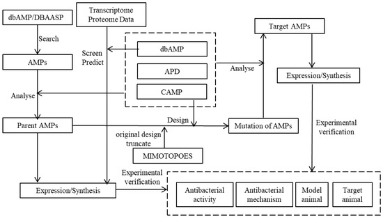 Based on the above extensive analysis of four AMP databases, an integrative approach to the design and construction of new AMP databases is proposed based on three essential key principles defined in the following three paragraphs (see Figure 5). The first key principle covers the following five points: (i) transcriptomic and proteomic data are obtained and analyzed from the dbAMP database by the AMPfinder function option; (ii) the hydrophobicity, isoelectric point, amphiphilicity, number of net charges, and other properties of the target peptide are predicted, screened, and designed by means of the AMP Calculator and predictor in the APD or the tools in the DBAASP; (iii) the druggability of candidate AMPs is analyzed and evaluated using CAMP; (iv) the key activity of AMPs on different specific target pathogenic species is predicted using the AMPpredictor and dbAMP database and then tested and screened by trials in vitro/vivo; (v) products are obtained by expression or chemical synthesis at a reasonable cost, and their bio-activity and mechanism are verified clearly by in vivo/in vitro experiments.