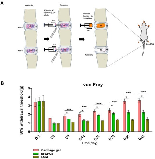 Immediately after making a nucleotomy model in Co4-5 and Co5-6, we injected the cartilage gel, hFCPCs, or ECM into the Co4-5 discs of each group, and we used the Co5-6 disc as a defect-only group (Figure 1A). To demonstrate the mechanical allodynia caused by nucleotomy, a von Frey filament was applied to the ventral base of the tail. The von Frey test was performed 2 days before (D-2) and 2, 7, 14, 21, 28, 35, and 42 days after surgery (Figure 1B). The increase in the pain sensitivity could result from the painful degenerative disc [39]. No significant differences between the three treatment groups were observed at the baseline (before surgery). The 50% withdrawal threshold (g) was significantly lower in the rats treated with the ECM or hFCPCs than in the rats treated with cartilage gel (one-way ANOVA, *** p < 0.001). However, the 50% withdrawal threshold (g) was significantly higher in the cartilage gel-treated group at 42 days, indicating that it significantly alleviated mechanical allodynia in the rat tail.
