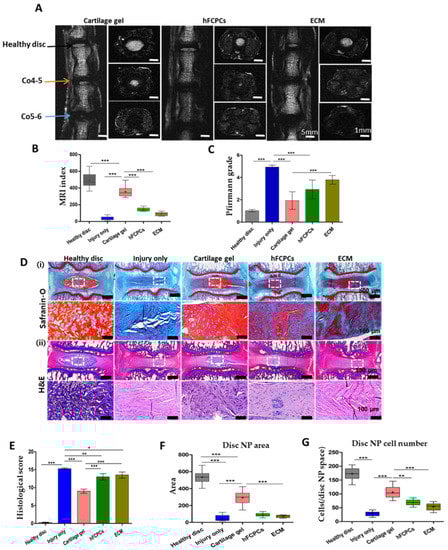 In vivo, we performed T2-weighted magnetic resonance imaging (MRI) six weeks (42 days) after implantation, to study the disc anatomy and water content in IVDs in the rat coccygeal disc. The MRI index was calculated for the healthy discs (Co3-4), injury-only discs (Co5-6), and the discs treated with cartilage gel, hFCPCs, or ECM (Co4-5) (Figure 2A,B). On coronal and axial T2-weighted MRI, the MRI index was found to be higher in the cartilage gel-implanted discs. By contrast, the hFCPC- and ECM-treated discs were found to have lower MRI index values than the cartilage gel-treated discs. The Pfirrmann grade was significantly lower in cartilage gel-treated discs in comparison to the injury-only, ECM, or hFCPCs-treated discs (one-way ANOVA *** p < 0.001) (Figure 2C). Overall, the MRI findings suggested that cartilage gel treatment preserved the water content and enabled the best restoration of disc anatomy with enhanced disc regeneration.