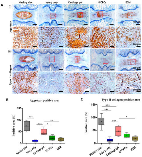 The cartilage gel preserved the matrix proteins in disc nucleus pulposus (NP) of a rat nucleotomy model. Immunohistochemical images of the indicated genes are presented for the healthy discs, injury-only discs, and the cartilage gel-injected, hFCPCs-injected, or ECM-injected discs at 6 weeks after surgery. (A) Immunohistochemistry of aggrecan (i) and type II collagen (ii). (B) Changes in the percentage of aggrecan-positive area in the disc NP spaces. The whole IVD images with merged signals are also presented at the bottom. (C) Changes in the percentage of type II collagen-positive area in the disc NP spaces. In (B,C), data are presented with box plots (n = 6, * p < 0.05; ** p < 0.01, *** p < 0.001, significant difference by one-way ANOVA). hFCPCs, human fetal cartilage-derived progenitor cells; ECM, extracellular matrix.