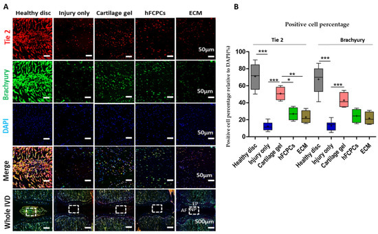 The cartilage gel preserved cells with endogenous phenotype in disc nucleus pulposus (NP) of a rat nucleotomy model. Immunofluorescence images of the indicated genes are presented for the healthy discs, injury-only discs, and the cartilage gel-injected, hFCPCs-injected, or ECM-injected discs at 6 weeks after surgery. (A) Immunofluorescence of brachyury (green) and Tie2 (red), DAPI (blue), and merged signals. (B) Changes in the percentage of Tie2 or brachyury-positive cells in the disc NP spaces. Immunopositivity was counted in disc NP of low-power fields and calculated as relative to the total number of DAPI-positive cells. In (A,B), data are presented with box plots (n = 4, * p < 0.05; ** p < 0.01, *** p < 0.001, significant difference by one-way ANOVA). hFCPCs, human fetal cartilage-derived progenitor cells; ECM, extracellular matrix.