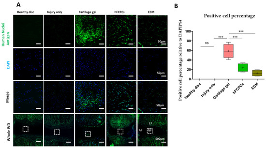 Preservation of implanted cells in the disc nucleus pulposus (NP) of a rat tail nucleotomy model. (A) Immunofluorescence of rat tails in the cartilage gel-injected, hFCPCs-injected, ECM-injected, healthy, and injury-only discs at six weeks after nucleotomy for human nuclei antigen (green), DAPI (blue), and merged signals. (B) Changes in the percentage of human nuclear antigen-positive cells. Immunopositivity was counted in the disc NP with low-power fields and calculated as relative to the total number of DAPI-positive cells. Data are presented with box plots (n = 4, *** p < 0.001, ns, not significant, significant difference by one-way ANOVA). hFCPCs, human fetal cartilage-derived progenitor cells; ECM, extracellular matrix.