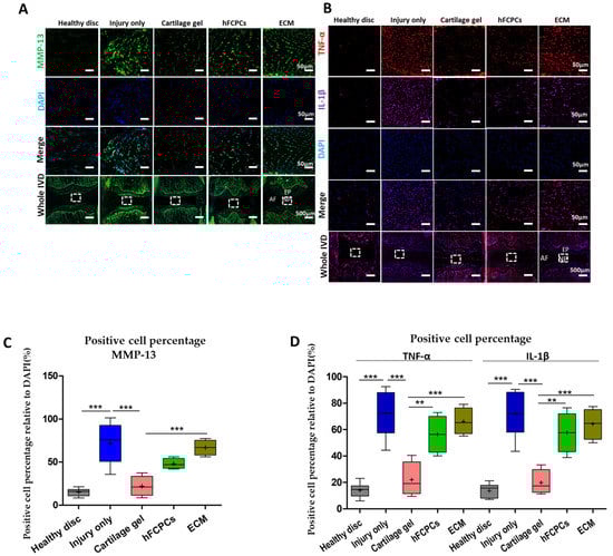 Cartilage gel downregulated catabolic and proinflammatory cytokines in the disc nucleus pulposus (NP) of a rat tail nucleotomy model. Immunofluorescence images of the indicated genes are presented for the healthy discs, injury-only discs, and the cartilage gel-injected, hFCPCs-injected, or ECM-injected discs at six weeks after surgery. (A) Immunofluorescence of the rat tail discs for matrix metalloproteinase-13 (MMP-13) (green), DAPI (blue), and merged signals. (B) Immunofluorescence of rat tail discs for tumor necrosis factor-alpha (TNF-α) (red) and interleukin (IL)-1β (purple), DAPI (blue) and merged signals. (C) Changes in the percentage of MMP-13-positive cells in the disc NP spaces. (D) Changes in the percentage of TNF-α- or IL-1 β-positive cells in the disc NP spaces. In (C,D) immunopositivity was counted in the disc NP with low-power fields and calculated as relative to the total number of DAPI-positive cells. Data are presented with box plots (n = 4, ** p < 0.01, *** p < 0.001, significant difference by one-way ANOVA).