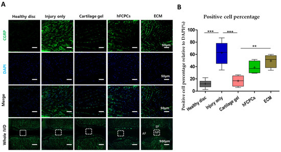 Further, we performed immunofluorescence staining for sensory neuropeptide, calcitonin gene receptor protein (CGRP), which acts as a pain modulator. A prior study found that CGRP and its receptors were activated abnormally in degenerated IVDs in comparison to normal IVDs [48]. Additionally, CGRP is known to be involved in sensitization of nerves, with increased expression indicated after injury [49]. We demonstrated the expression of CGRP in healthy, injury-only, cartilage gel-treated, hFCPCs-treated, and ECM-implanted discs (Figure 7A). The immunoreactivity of CGRP in the healthy discs was lowest, followed by cartilage gel-treated discs. Likewise, the hFCPCs and ECM demonstrated significantly increased expression of CGRP, similarly to the injury-only discs. The expression of CGRP was significantly higher in the injury-only discs (one-way ANOVA, *** p < 0.001) (Figure 7A,B). Thus, these results confirmed that cartilage gel treatment reduced injury-induced pain in IVD.