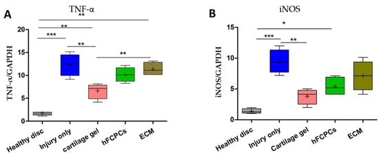 Cartilage gel downregulated mRNA levels of proinflammatory cytokines in the disc nucleus pulposus (NP) of a rat tail nucleotomy model. (A) mRNA levels of TNF-α in the disc NP spaces. (B) mRNA levels of iNOS in the disc NP spaces. In (A,B), data are presented in box plots (n = 3, * p < 0.05; ** p < 0.01; *** p < 0.001, significant difference by one-way ANOVA).