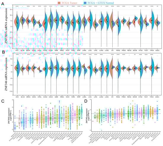 ZNF385A and ZNF346 expression in different types of human cancers and cell lines. (A,B) Increased or decreased ZNF385A and ZNF346 expression in different cancers, compared with normal tissues, by the TCGA and GTEx databases (* p < 0.05, ** p < 0.01, *** p < 0.001, **** p < 0.0001). (C,D) The expression of ZNF385A and ZNF346 in tumor cell lines, based on the CCLE database.